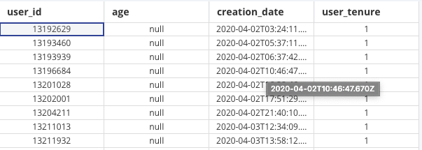 round(timestamp_diff(current_timestamp(), creation_date, day)/365) as user_tenure