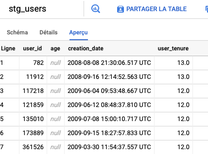 En effet, la table stg_users a été créée pour nous dans BigQuery: